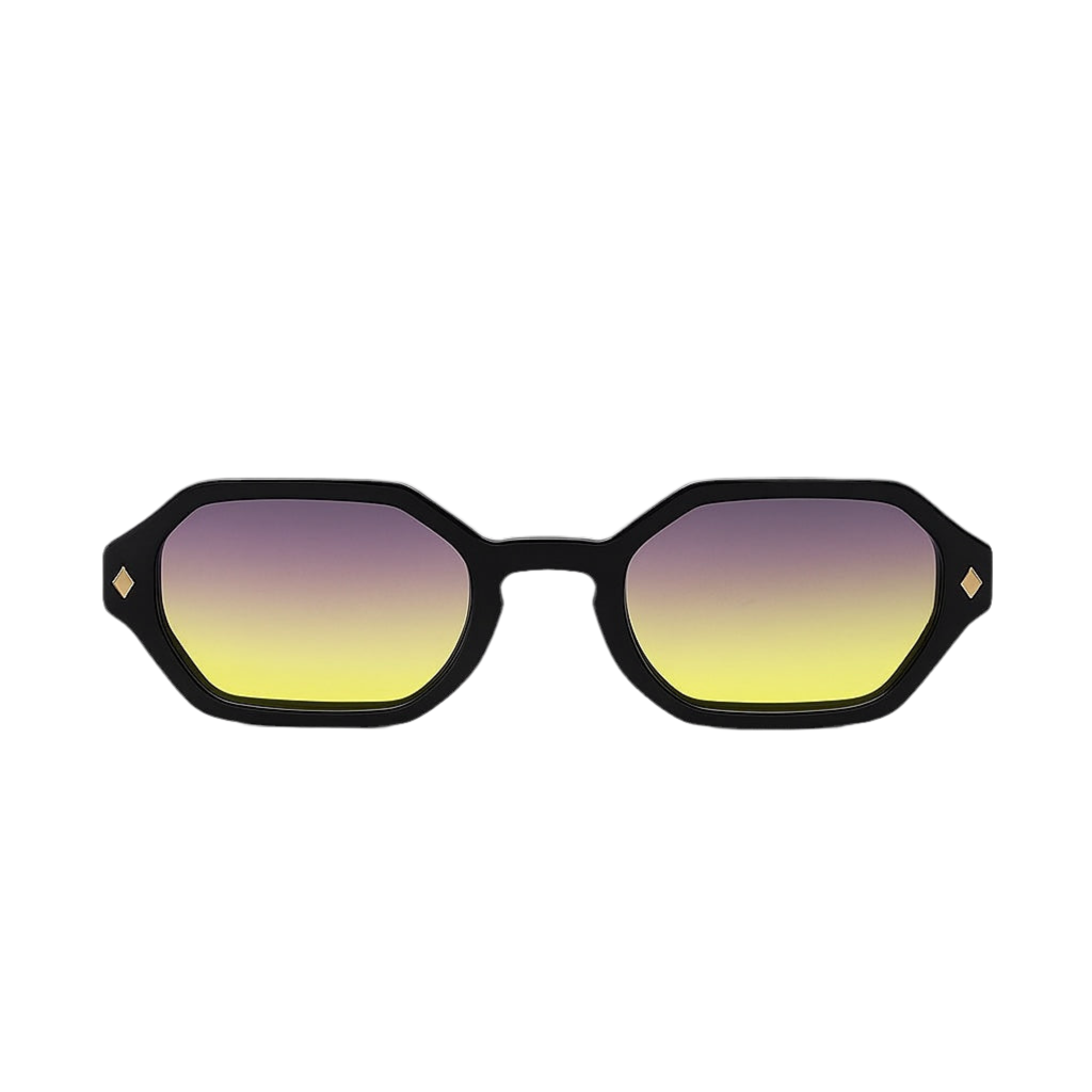 Deze stijlvolle zonnebril straalt originaliteit uit. Het gdoe, karaktervolle montuur wordt gecombineerd met glazen die op magische wijze van oranke naar geel veranderen, afhankelijk van het zonlicht. Deze bijzondere kleurcombinatie zorgt voor een speels maar elegant effect. Een perfecte bril voor wie houdt van verfijnde details en een unieke uitstraling.