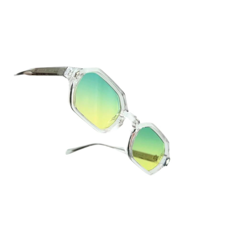 Deze opvallende zonnebril is een echte eyecatcher. Het transparante, hoekige montuur geeft een moderne en stijlvolle uitstraling, terwijl de Groene glazen een prachtig kleurenspel tonen — van diep donkerblauw tot helder lichtblauw, afhankelijk van hoe het zonlicht erop valt. Deze bril combineert uniek design met een frisse, zomerse flair. Perfect voor wie durft op te vallen met klasse.