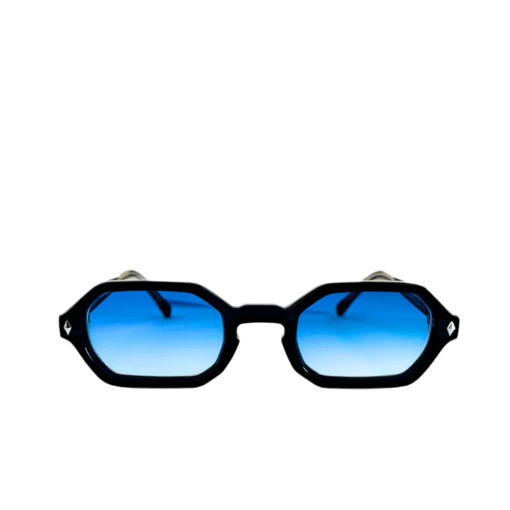 Deze opvallende zonnebril is een echte eyecatcher. Het zwarte, hoekige montuur geeft een moderne en stijlvolle uitstraling, terwijl de blauwe glazen een prachtig kleurenspel tonen — van diep donkerblauw tot helder lichtblauw, afhankelijk van hoe het zonlicht erop valt. Deze bril combineert uniek design met een frisse, zomerse flair. Perfect voor wie durft op te vallen met klasse.